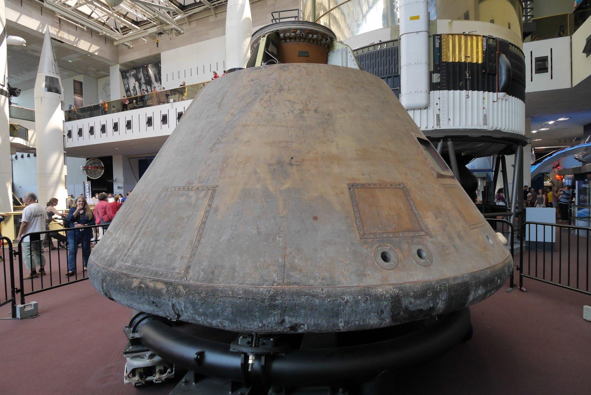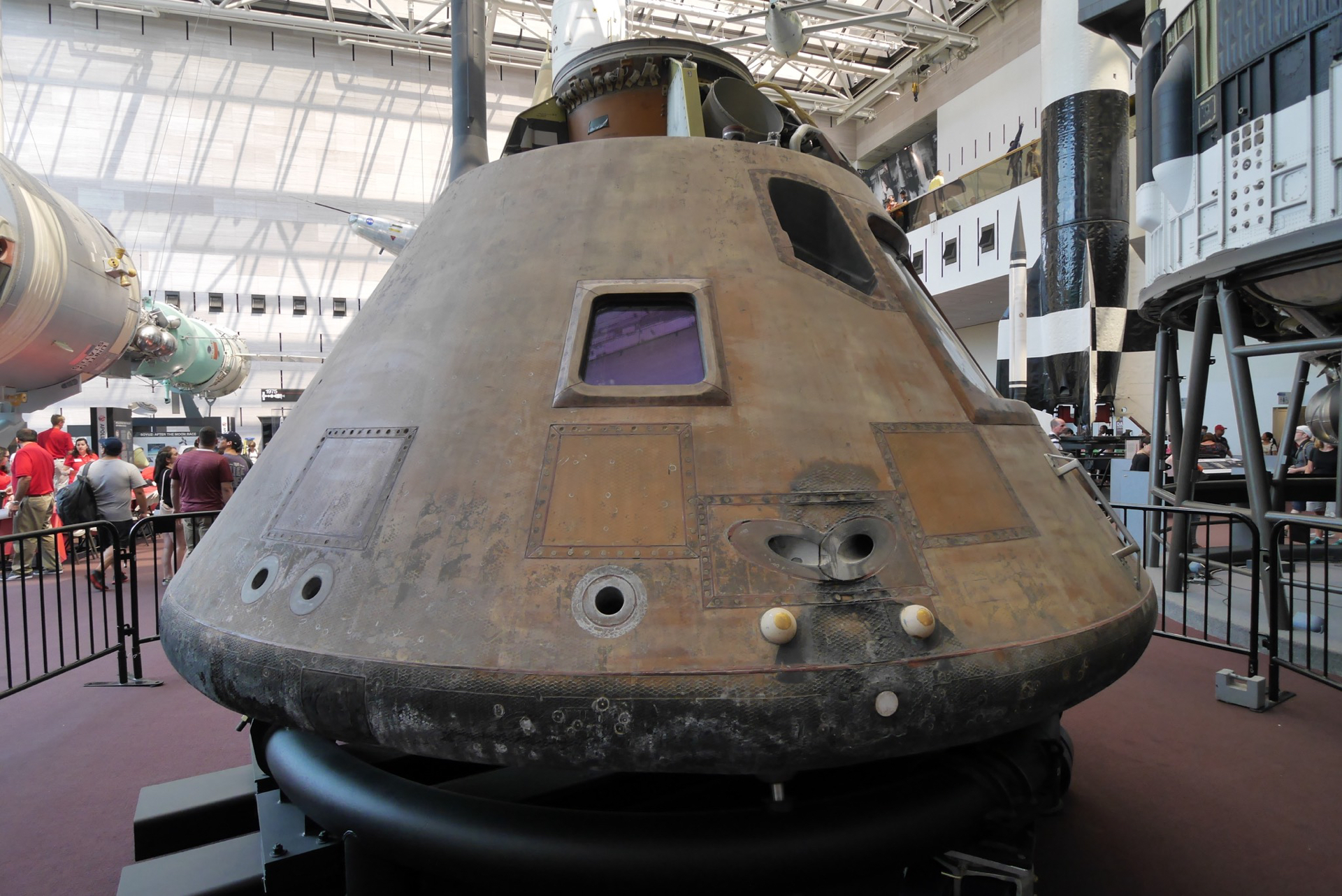 The Apollo 11 command module carried astronauts Neil Armstrong, Buzz Aldrin and Michael Collins around the dark side of the moon and back to earth on the first lunar landing mission.
