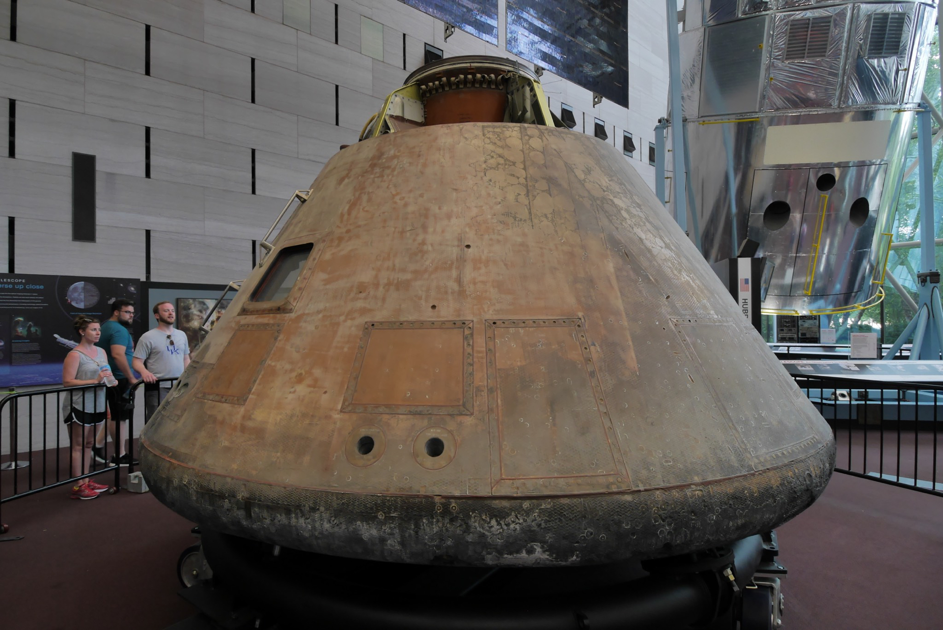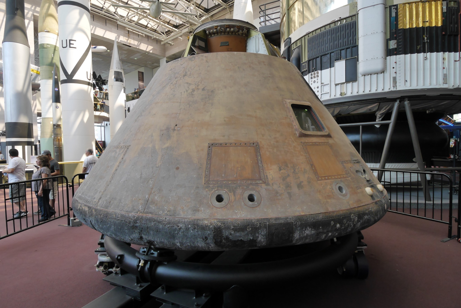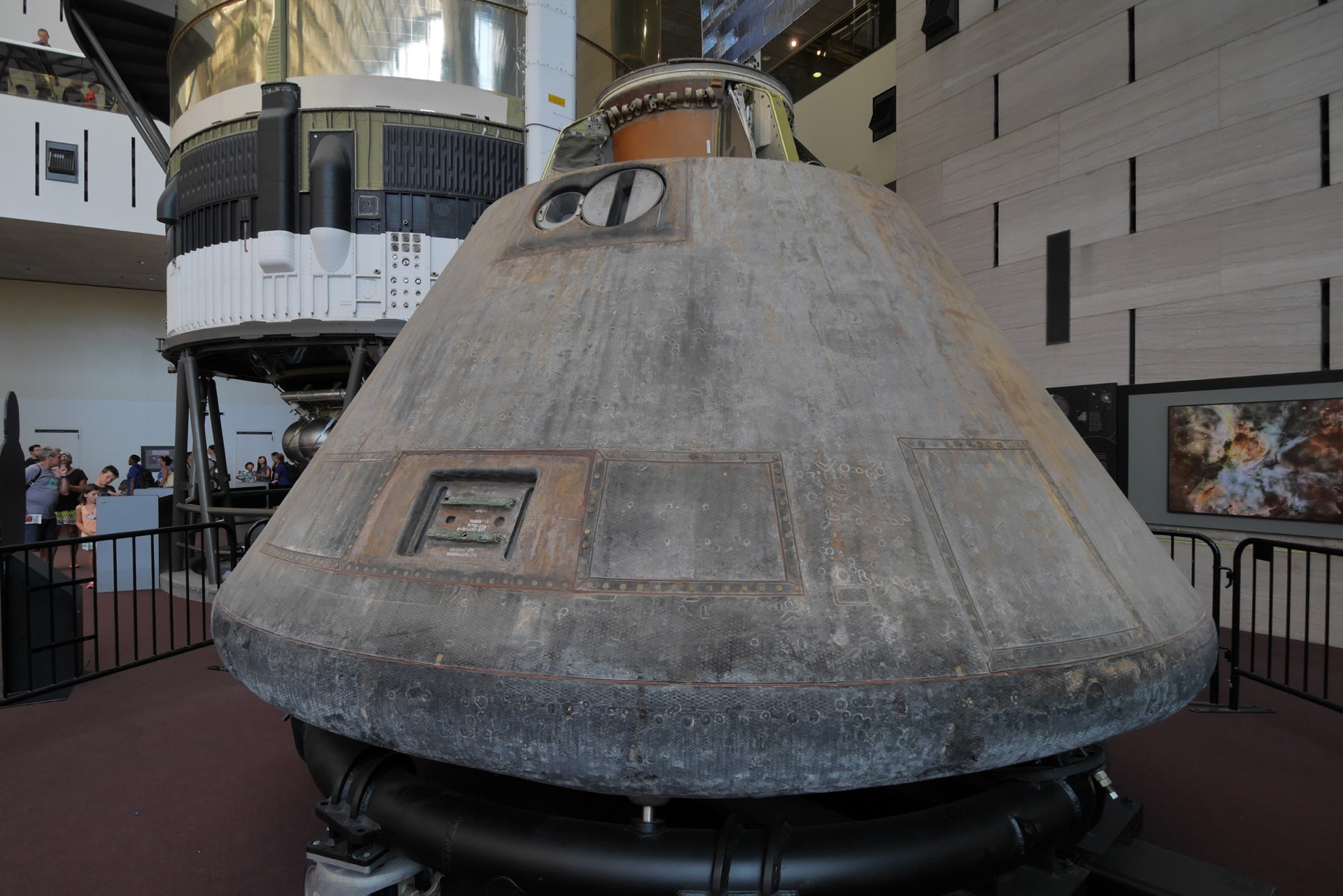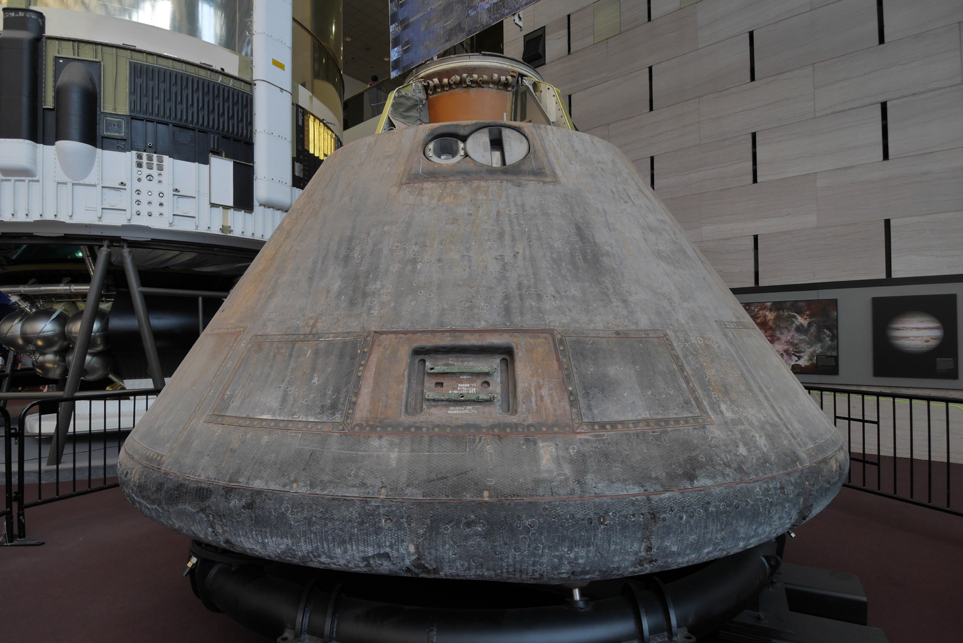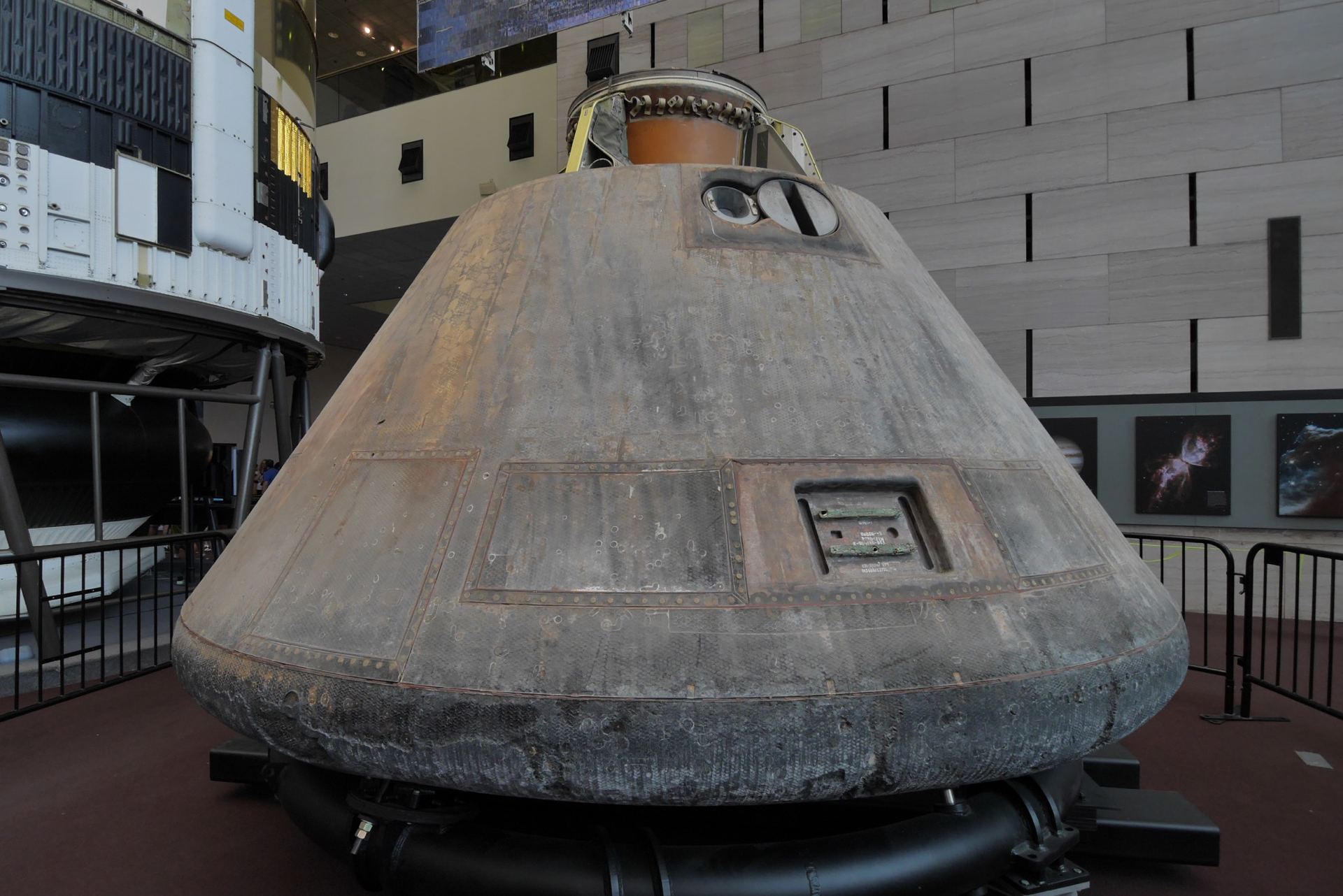 The Apollo 11 command module carried astronauts Neil Armstrong, Buzz Aldrin and Michael Collins around the dark side of the moon and back to earth on the first lunar landing mission.