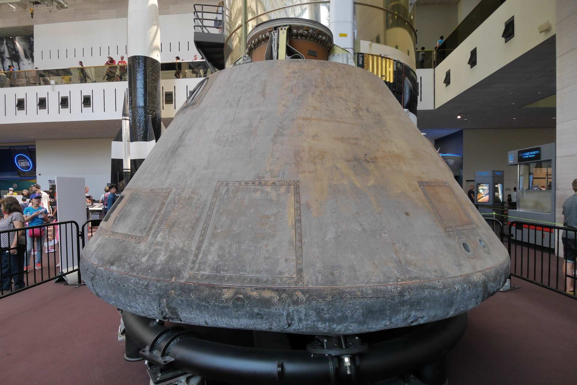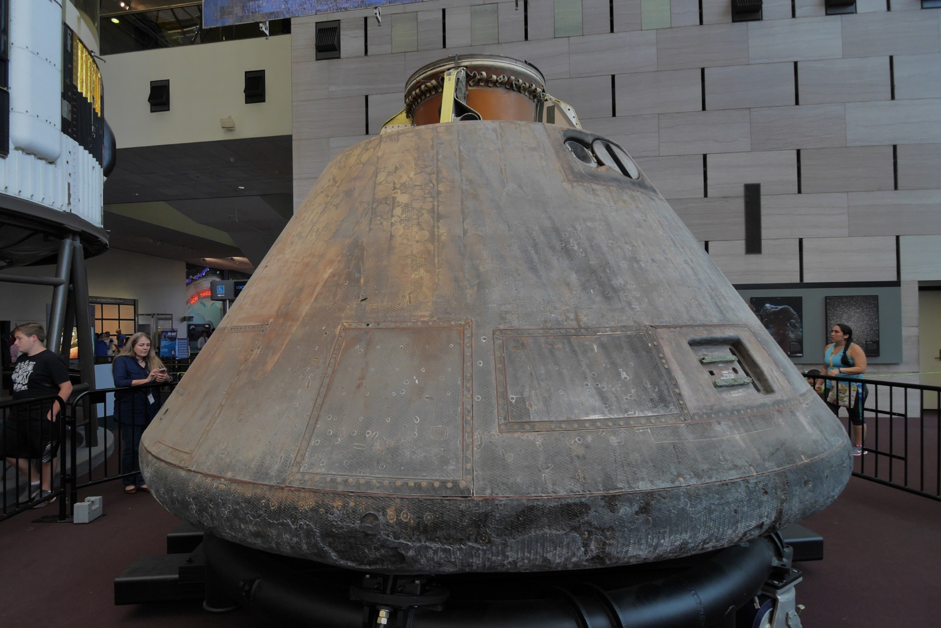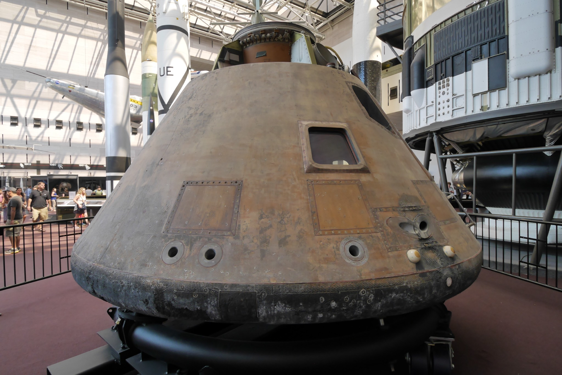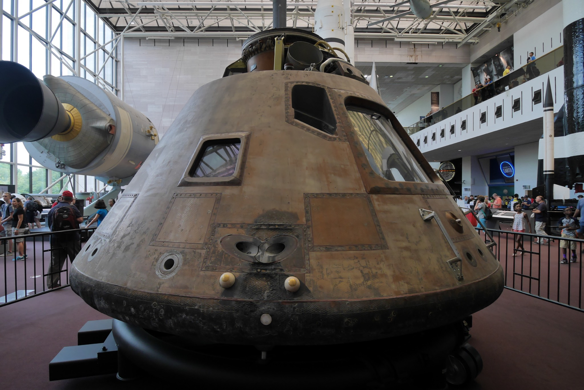 The Apollo 11 command module carried astronauts Neil Armstrong, Buzz Aldrin and Michael Collins around the dark side of the moon and back to earth on the first lunar landing mission.